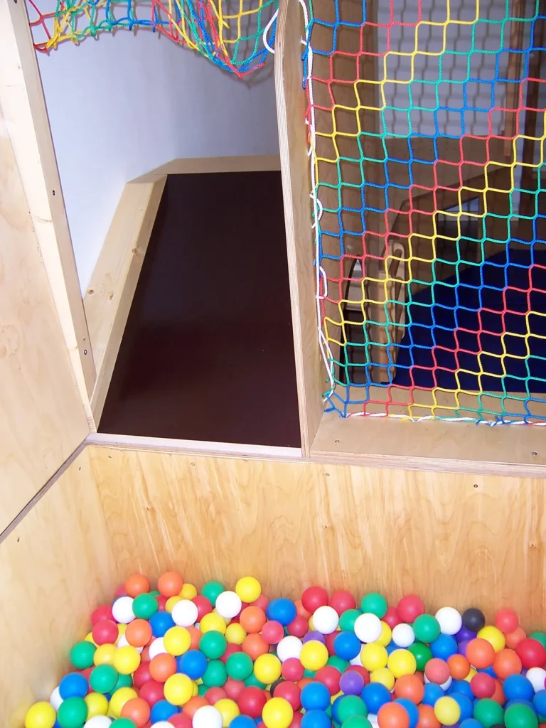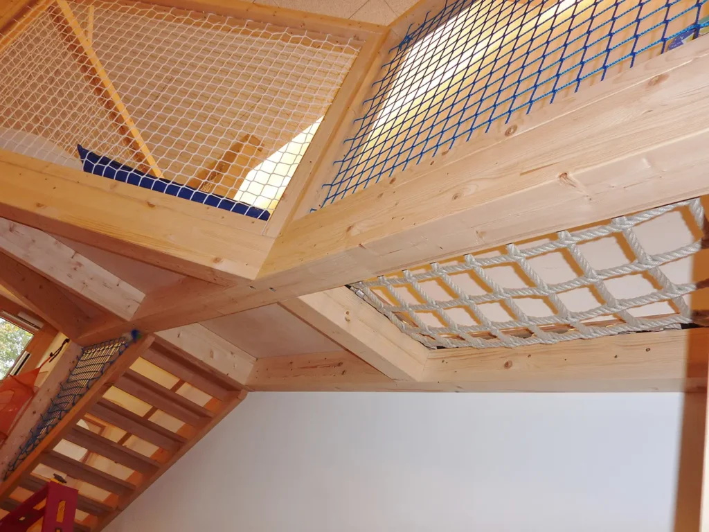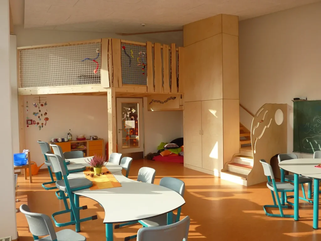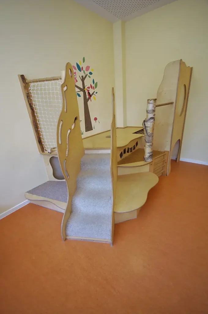 Wir schaffen ideale Möglichkeiten für Bewegungskonzepte zur Förderung der Kinder. Zum Beispiel mit raumüberspannenden Schaukelbalken, ausgerüstet mit verschiebbaren Schlitten an denen Kletternetze oder Schaukeln angebracht werden können. Oder schwenkbare Sprossenwände.
