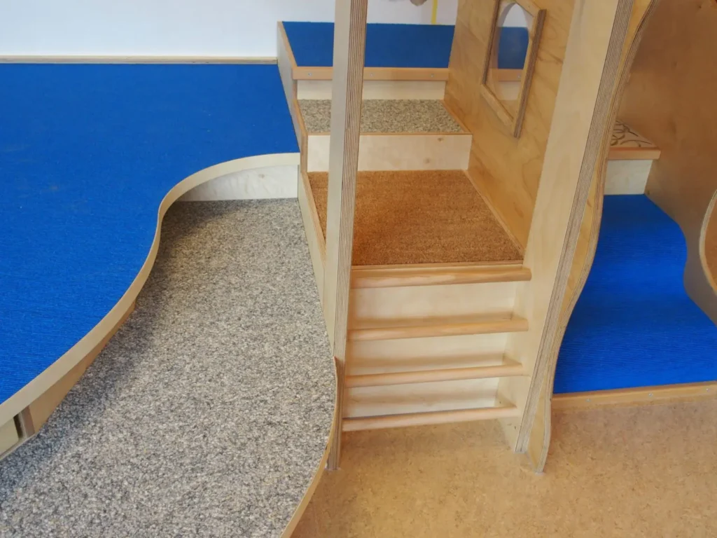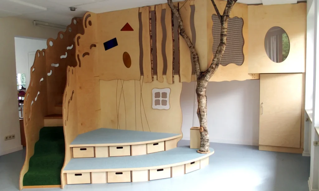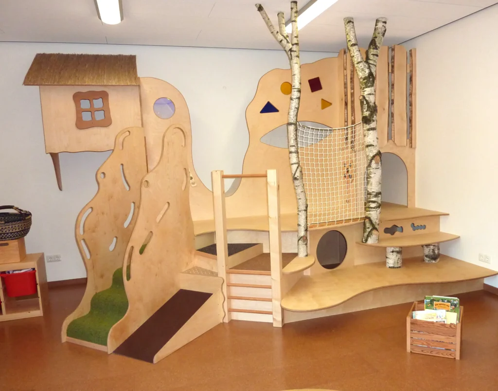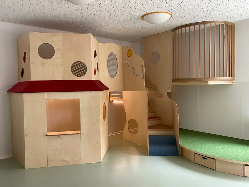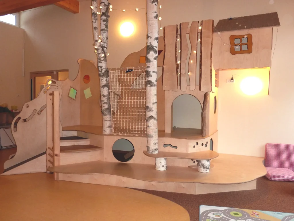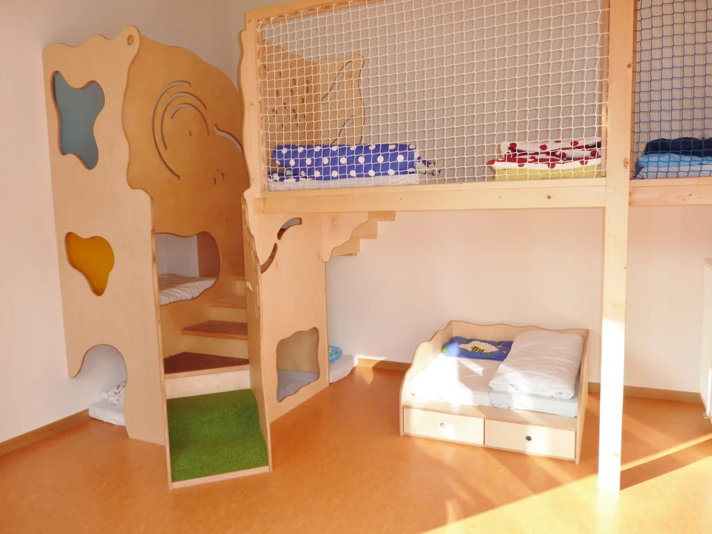 Bei unseren Podesten wird der verfügbare Raum multifunktional genutzt. So können beispielsweise im Krippenraum auf der Ebene wo gerade noch gespielt wurde mit wenigen Handgriffen mehrere Schlafplätze geschaffen werden.